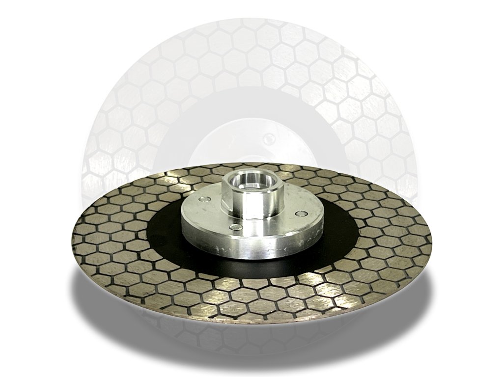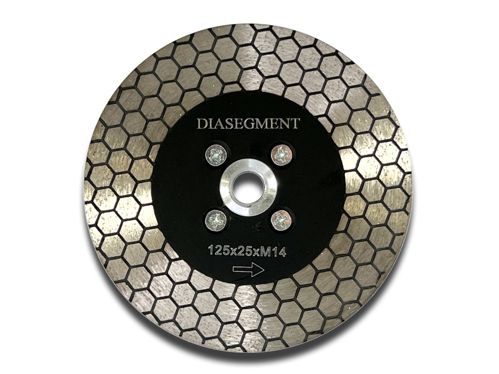 Diamantový, přírubový brusno-řezný kotouč vhodný pro práci za sucha. Nástroj má 25 mm širokou brusnou plochu na obou stranách, primárně určenou pro hrubší opracování a tvarování obkladových materiálů.