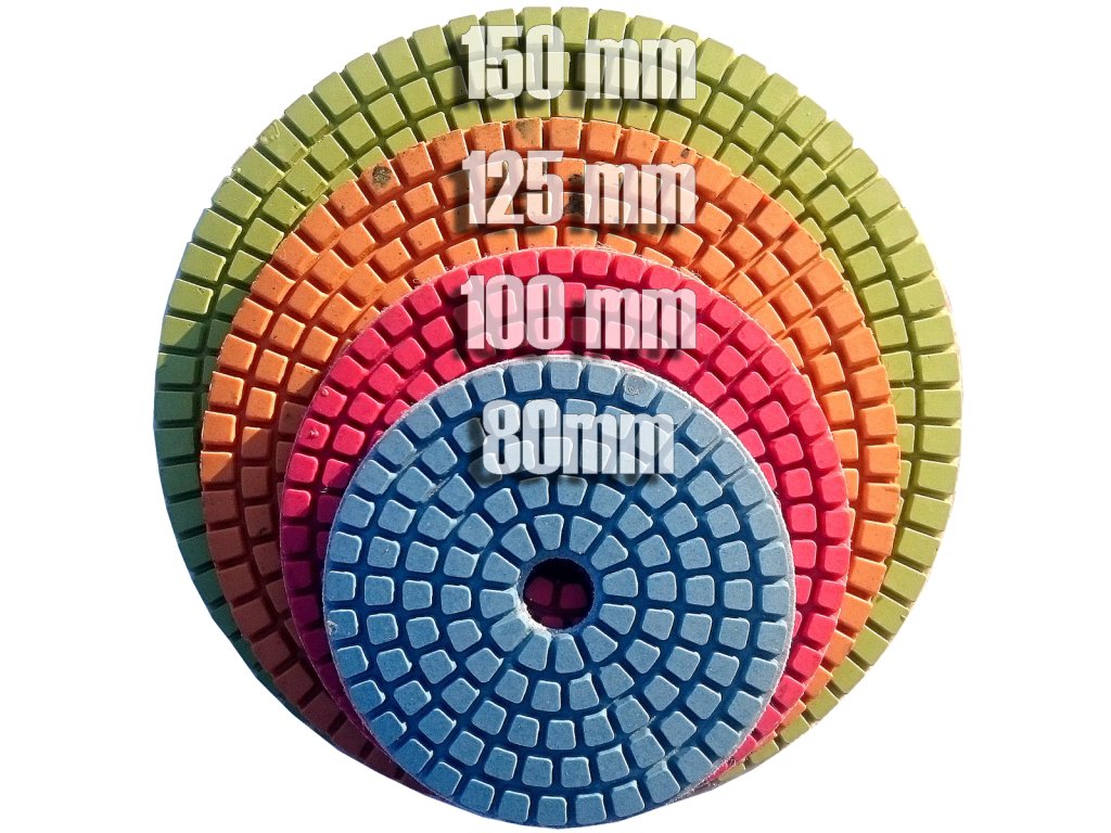 průměr 80 mm: Pro malé ruční brusky, vhodné na leštění malých ploch, koutů, rádiusů a zápichů. Opracujete místa, kam se nedostanete s větším průměrem. Vhodné i pro detailní kamenosochařské práce