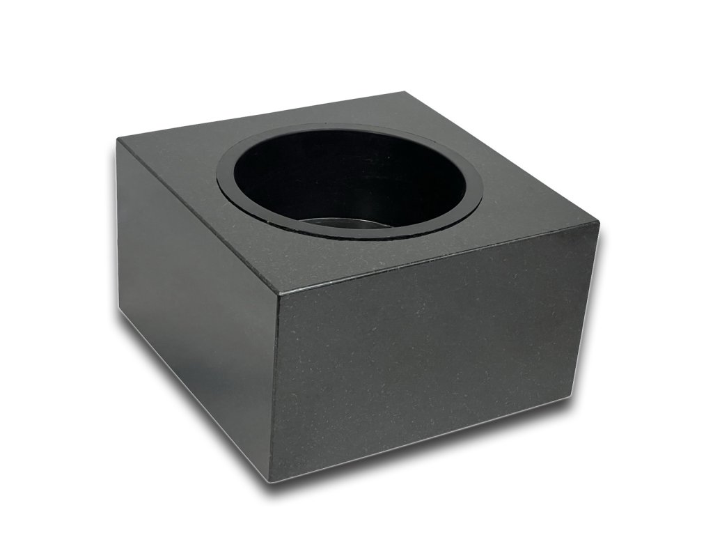 Masivní čtvercová kamenná mísa vhodná jako dominantní doplněk k výjimečným hřbitovním stavbám.