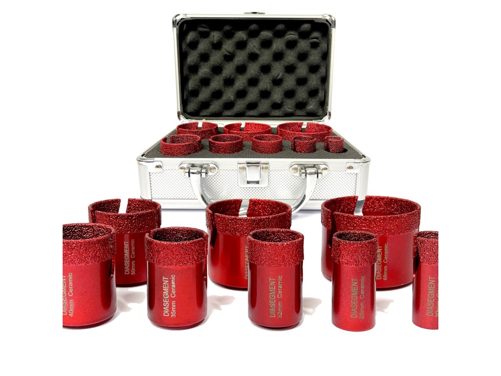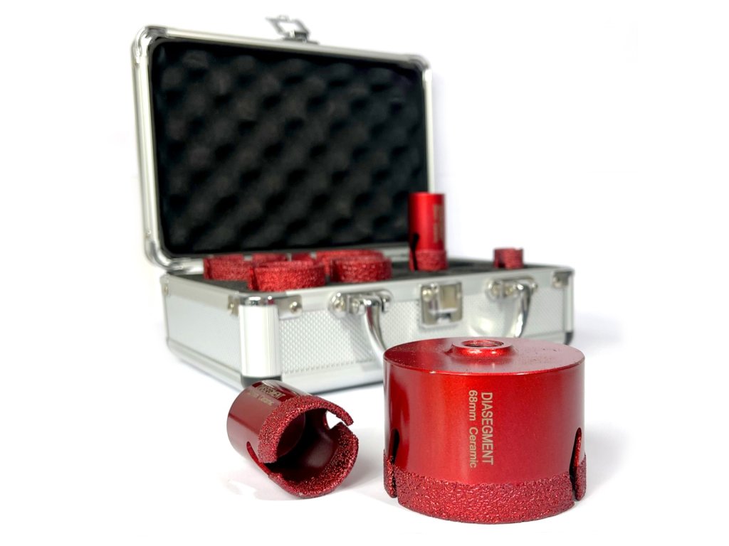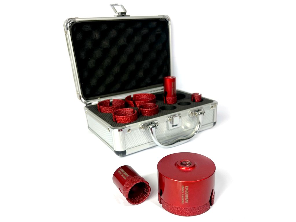 Sada osmi profesionálních diamantových korunek v praktickém kufříku.