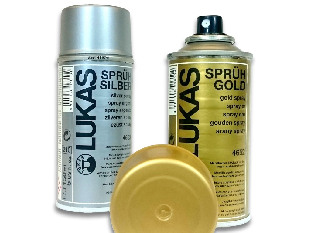 Stříbrná a zlatá barva ve spreji. Oblíbený při obnově starého, sekaného písma. Barevná stálost, vhodné do exteriéru.