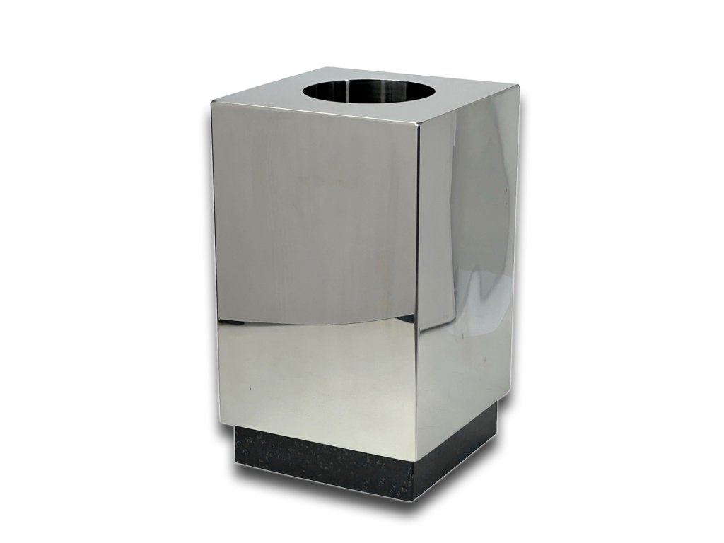 Elegantní váza se čtvercovou žulovou podstavou a vysoce leštěným pláštěm z nerezavějícího plechu.